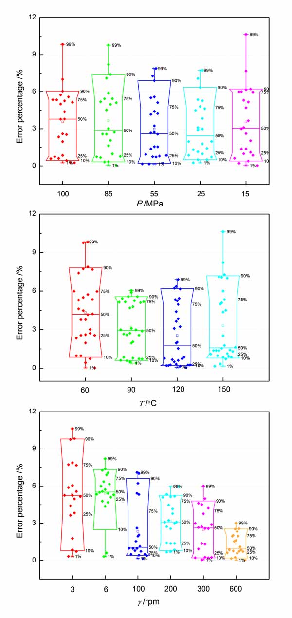 Fig. (2). Box plots of error percentage vs. P, T, and γ, respectively, for the RDR models, where the 10th, 25th, 50th, 75th, and 90th percentile of deviation dataset are marked. |