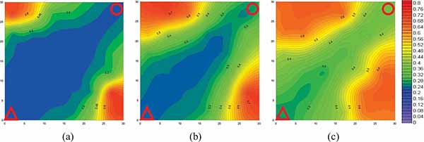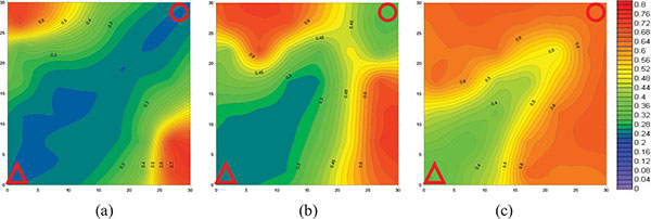 Fig. (10). Oil saturation distribution of each layer (Scheme 2-1). (a) high permeability layer; (b) medium permeability layer; (c) low permeability layer. Where, ∆ represents injection well, and ○ represents production well.