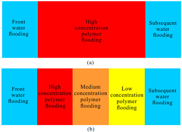 Fig. (2). Two types of polymer flooding development modes. (a) constant concentration; (b) variable concentrations.