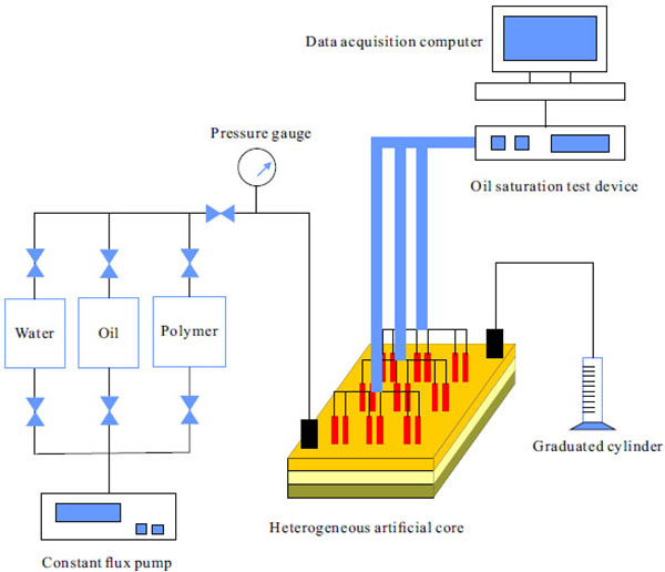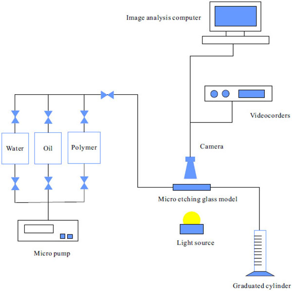 The experimental equipments are as follows: Constant-temperature cabinet; DV-III Brookfield viscometer; Pressure gage; LB-1 Constant flux pump; Micro pump; WCJ-801 Magnetic stirrer; Oil saturation test device; Data acquisition computer; Videocorders; Image analysis computer; Graduated cylinder.