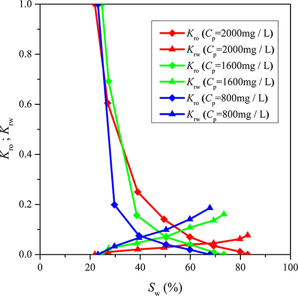 Fig. (6) shows the influence of polymer concentration to the relative permeability curves. Under the condition of the same water saturation, the relative permeability of water phase (polymer system) decreases and the relative permeability of oil phase increases with the increase of polymer concentration. The adsorption, mechanical capture and hydrodynamic capture of the polymer molecules exist on the wall of pore throats, and then the molecules are trapped in the cores, which narrows flow channels and reduces the flow capacity of the polymer system. In addition, there's strong hydrogen bonding between polymer molecules and water molecules, which enhances the adsorption of water molecules on the adsorption layer and reduces the relative permeability of polymer system significantly. The higher the polymer concentration, the stronger will be the effect. However, polymer molecules will not restrict the flow of oil phase significantly, and the adsorption layer formed by polymer molecules on the wall of pores can make pore throats smoother. To a certain extent, it will reduce the seepage resistance of oil phase when flowing in cores, which increases the relative permeability of oil phase.