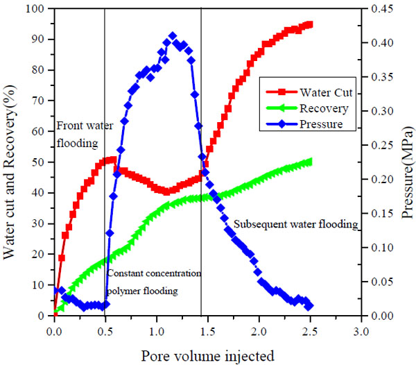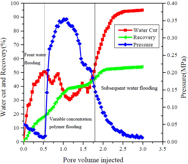 As shown in Fig. (8) and Table 3, 0.4 PV high concentration polymer solution (Cp=2000 mg/L) was injected at the end of water flooding stage. High concentration polymer always flowed into the dominant channel formed in high permeability layer. It had a certain profile control effect and improved the local pressure gradient of high permeability layer, which led to a sharp rise of injection pressure. Then 0.8 PV medium concentration polymer solution (Cp=1600 mg/L) + 0.4 PV low concentration polymer solution (Cp=800 mg/L) were injected subsequently, and the injection pressure increased slowly. As the lower concentration polymer flowed into the medium and low permeability layer, the remaining oil was produced gradually. At the same time, the water cut reduced and the recovery of polymer flooding stage was from 18.70% to 43.10%.