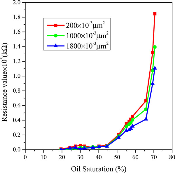 In general, the rock skeleton does not conduct electricity, and the higher the ion concentration of formation water, the smaller the resistance value. The measured resistance value of formation is mainly affected by pore shape, formation water salinity and oil-water ratio. Under the same conditions of pore shape and formation water salinity, the resistance value is only influenced by oil-water ratio. The relation curves between the oil saturation and the resistance value (shown in Fig. 9) was determined by the steady state method.