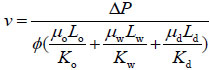 where, v is the velocity of displacement front, μO, μW and μd are the viscosity of oil, water and displacement agent respectively, LO, LW and Ld are the equivalent length of oil area, water area and displacement agent area respectively, KO, KW and Kd are the equivalent permeability of oil area, water area and displacement agent area respectively, and ϕ is the formation porosity.