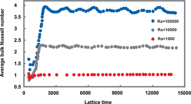 Fig. (18) displays the average bulk Nusselt number variations with the time step at various Rayleigh numbers. The results show that the convection cannot occur in Ra=103 and higher Ra is needed in order to the thermally induced buoyancy can overcome the effects of flow resistance. However, the bulk average Nusselt number rises as the Rayleigh number increases. Moreover, the magnitude of the fluctuations also increases with the Rayleigh number increment. Therefore, the stability of model decreases with increasing the Rayleigh number in the SCMP model.