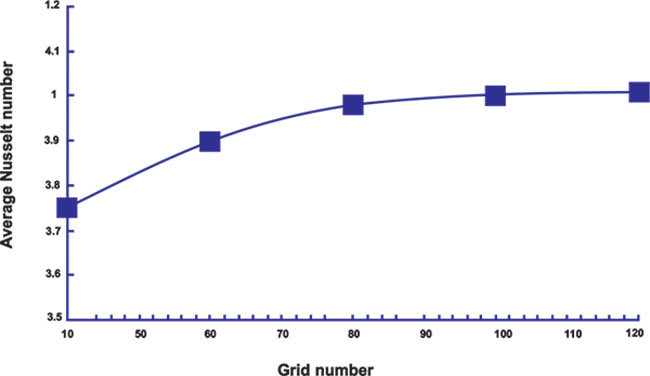 where gy is the acceleration due to gravity, β is the thermal expansion coefficient, T 0 is the reference temperature, which is set as Tc (temperatures of the low temperature wall) in this simulation. ρ 0 is the density of the fluid at T0. Therefore, the macroscopic dimensionless counterpart of the meso-scale governing equations for the natural convection with Boussinesq approximation for incompressible flow is as follows [5, 26]: