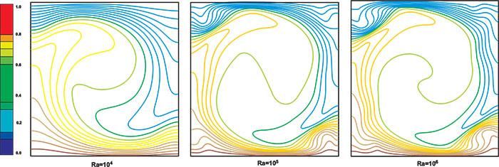 Fig. (17). Isothermal contours in SCMP LBE model at different Ra numbers.