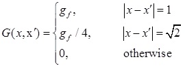 where x and x'(=x + eiδt) show the position in space G(x, x') and denotes intermolecular forces between particles. The term G(x, x') ≤ = 0 represents attractive forces between particles. In our study, the interactions of nearest and next-nearest neighbors are considered, therefore, for a D2Q9 lattice model, this leads to below correlation in Equation 14 [31]: