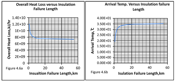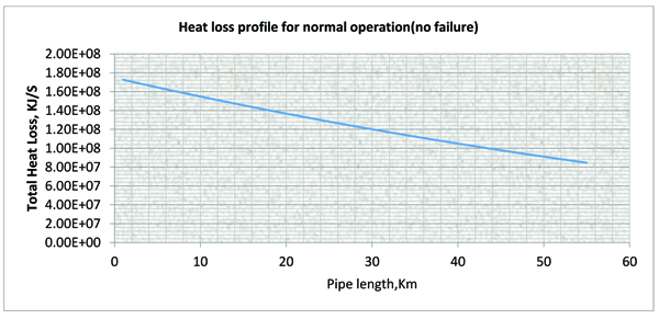 It can be deduced from Fig. (9), that the arrival temperature is constant for normal operation (that is when there is no insulation failure) because the overall heat loss is constant but the arrival temperatures varies (reduces) for failed operations due to increase in the overall heat loss resulting from the reduction in thermal resistance at the pipe section where the insulation failed. The reduction in arrival temperature is pronounce when the insulation failure is closer to departure point due to high heat loss at that point and approaches the value of that of normal operation when the failure is close to the arrival point due to low heat loss at that point.