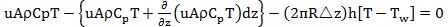 Now, along the axis, heat can enter and leave the element only by convection flow, so we can write the elemental form of Eq. 1 as: