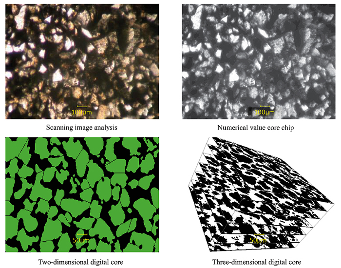 Traditional rock sensitivity research primarily depends on indoor flooding experiments, such as velocity sensitivity, salt sensitivity, acid sensitivity, alkali sensitivity, and stress sensitivity. In some special cases, however, the limitations of sampling and experimental conditions make the experimental process and results impossible to achieve. In recent years, with the development of computer science and high-resolution image processing technology [1-3], digital core technology has been gradually introduced into physical reservoir research, resulting in a new research method [4, 5] Using a real rock pore space reaction 3D digital core based on a rock microstructure reconstruction [6-8], the research scope involves microscopic percolation mechanisms, core displacement simulation experiments, prediction of core macroscopic conductivity, evaluation of oil displacement effects, production dynamic simulation of reservoirs and determining the boundaries of oil and gas field development technology policies [9]. Compared with the traditional physical rock experiments, digital core samples are readily available, high-speed, and low-cost, and they make it possible to quantitatively evaluate rock properties and calculate physical quantities that are difficult for conventional physical experiments to measure [10]. Currently, the digital core has been widely used for carbonate reservoirs, shale gas, and tight oil and gas reservoirs [11-15] with good results.