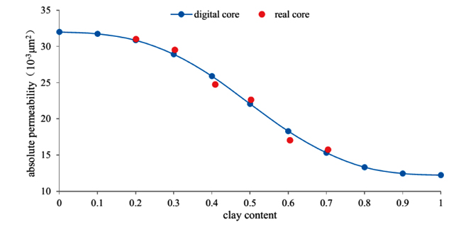 Fig. (13). Comparison of permeability influenced by clay content between the real core and digital core. |