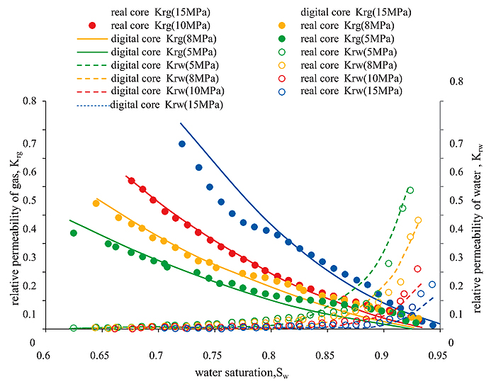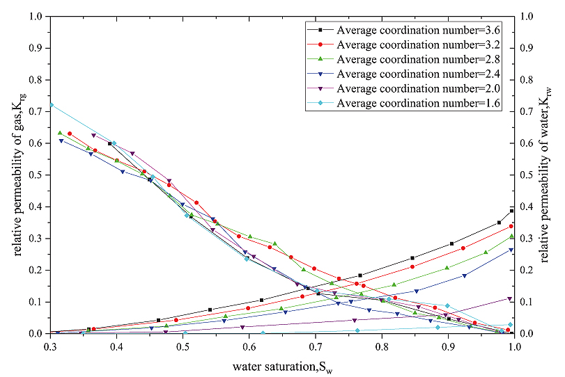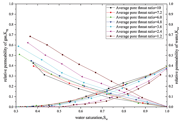 Then, using the porosity and permeability, combined with the characteristic parameters of the dynamic model, we calculate the characteristic parameters after pressure changes: The average pore-throat radius, average shape factor, average coordination number and the average pore-throat ratio (shown in Table 2). Finally, the pore network model program is used to calculate the relative permeability curve after pressure changes (Fig. 15).