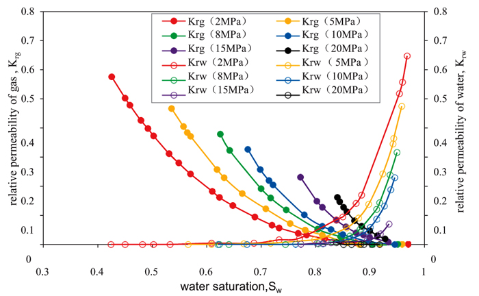 The relationship between Gas phase relative permeability krw and Water saturation Sw in different porosity ratio of SeiBei loose sandstone can be transformed with the binomial relation (Fig. 5).