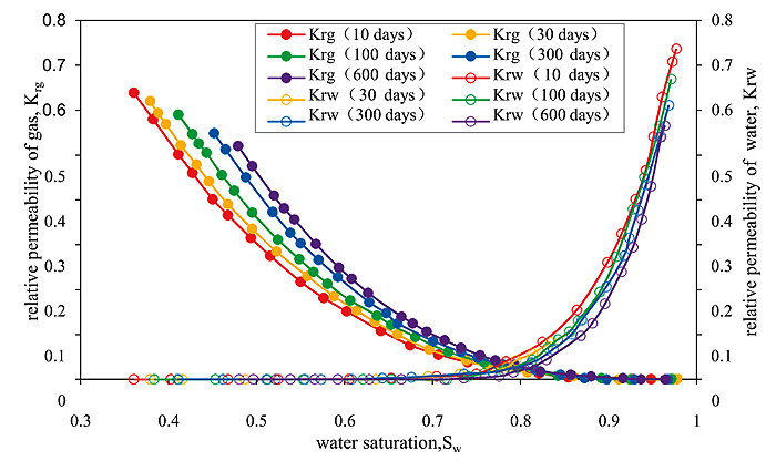 The results show that as the water immersion time of the rocks varies from 10 days to 30 days, the clay gradually expands in the sandstone, the pore-throats are narrowed, the capillary pressure becomes large, the two-phase percolation region is narrowed, and the relative flowability of the non-wetting phase increases by more than 5.7%, whereas the relative flowability of the wetting phase decreases by more than 5.7%. When the core is in prolonged contact with water, up to 300 days, the change in the pore structure parameters is very small. This result indicates that the gas well production capacity in the SeBei field would decline significantly after the invasion and soaking with water, and therefore we must take effective waterproofing, water control and flood control measures in the process of development.