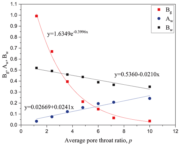 Because the gas saturation lower than 1, and Ag is the coefficient of quadratic function squared, Bg is the coefficient of the quadratic function. So the influence of Bg on gas phase relative permeability is greater than Ag. The relationship between the gas phase coefficient Bg and the pore throat ratio (p) satisfies the exponential function, which shows in Fig. (6).