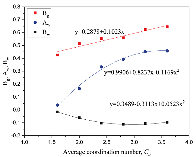The relationship between the gas phase coefficient Bg and the average coordination number (Ca) satisfies the linear function relation, and the water phase coefficient Aw, Bw and the average coordination number can satisfy the quadratic function relationship, as shown in Fig. (8)