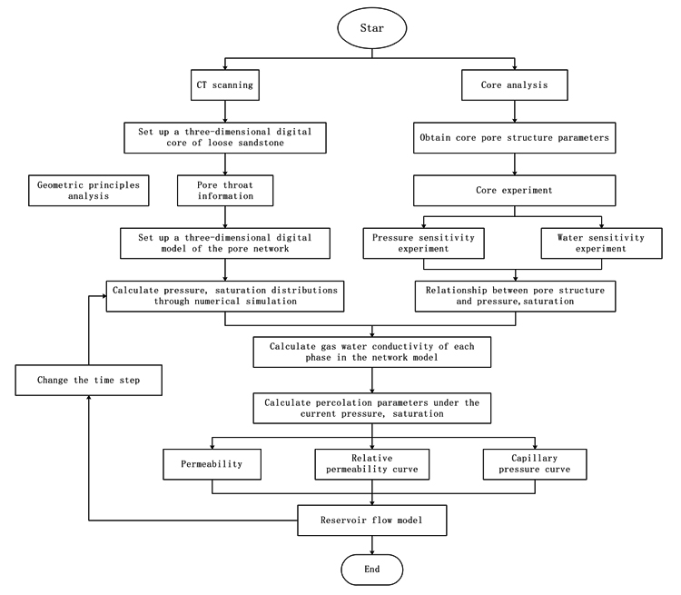 First, we scan the core sample by using the CT scanner. Thus, a three-dimensional image of the core can be obtained, the digital information can be extracted, the pore structure of porous media is mapped directly to the network, and a digital core is established using the principles of fractal geometry. The three-dimensional pore network model can also be extracted and is then used to calculate the percolation parameters in different stress states and under different water cut conditions, focusing on permeability, relative permeability and capillary pressure. The process of constructing the digital core model is shown in Fig. (1).