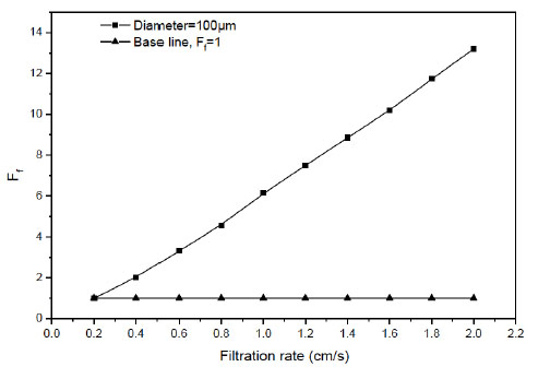 Fig. (6). Relation between Ff and filtration rate (diameter of particle is 100 µm). |