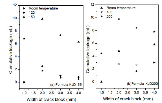 Results of sealing ability evaluation of removable plugging slurry KJD155 are presented in Table 4. For 1 mm crack block, cumulative leakage of slurry KJD155 was zero at room temperature and 120 °C, 6.8 mL at 150 °C when pressure was up to 5 MPa. For 2 mm crack block, cumulative leakage at room temperature, 120 °C, 150 °C was 1.8 mL, 2.5 mL, 9.9 mL separately. For 3 mm crack block, cumulative leaked volume at room temperature, 120 °C, 150°C was 0.7 mL, 1 mL, 7.3 mL respectively. For 4 mm fracture module, cumulative leakage at room temperature, 120 °C, 150°C was 0.5 mL, 0.8 mL, and 6.3 mL separately. The formula KJD155 sealed 1 mm, 2 mm, 3 mm, and 4 mm crack blocks at room temperature, 120 °C and 150 °C. It could be seen from Table 5 that the formula KJD200 plugged 1 mm, 2 mm, 3 mm, 4 mm crack blocks at room temperature, 180 °C and 200 °C effectively. At room temperature, the cumulative leakage of formula KJD200 through 1 mm, 2 mm, 3 mm, and 4 mm crack blocks was 0, 4.8 mL, 1.6 mL, 5.8 mL separately. At 180 °C, the cumulative leakage of formula KJD200 through 1 mm, 2 mm, 3 mm, and 4 mm crack blocks was 0, 2.8 mL, 2.6 mL, 3.0 mL respectively. At 200 °C, the cumulative leakage of formula KJD200 through 1 mm, 2 mm, 3 mm, and 4 mm crack blocks was 4.4, 9.8 mL, 8.4 mL, and 7.8 mL separately. Before pressuring, cumulative leakage of formulas KJD155 and KJD200 was 0 or small value through different leakage medium, showing that they bridged and filled quickly in fractures to prevent fluid leaking. For the same crack block, cumulative leakages of formulas KJD155 and KJD200 at higher temperature were greater than that at lower temperature, but they were smaller than 10.0 mL (Fig. 7). Bearing pressure ability of plugging slurries KJD155 and KJD200 was up to 5 MPa, which was beneficial to the next operation such as continuative drilling or completion.