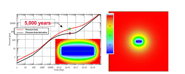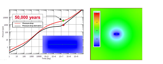 Fig. (9). Simulation response after five thousand years. Infinite acting radial flow regime is established. Pressure distribution at 5,000 years is shown. |