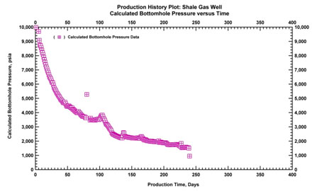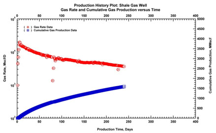 We were initially given 8 months of production data, with both rates and surface pressure. Water flowback was noted during the clean-up (i.e., the first hundred hours of production). A series of analyses were done using the different tools available at the time. All these tools were used to history-match the data and forecasts were generated assuming a constant final flowing pressure. The three forecasts, matching the same data, gave different forecasts and EUR values.