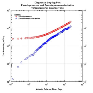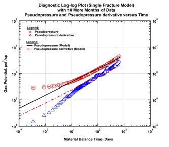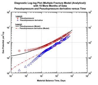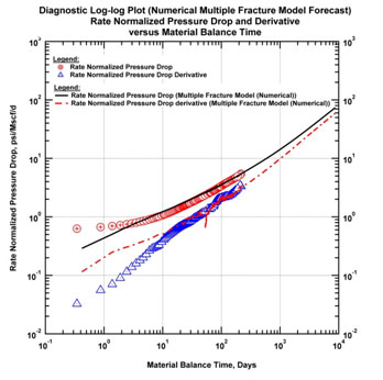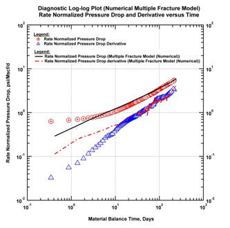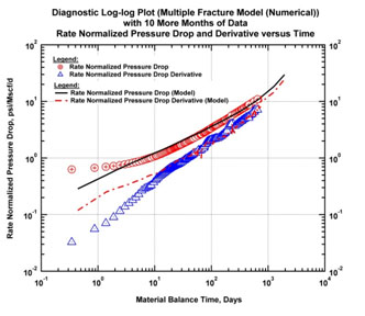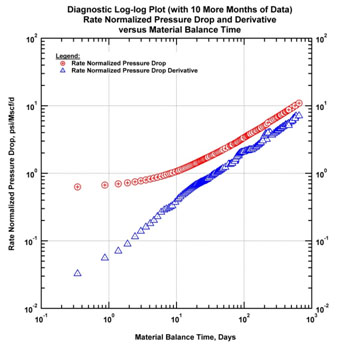 The fractures then begin to interfere. In this example, the next series of figures below show the response after three months. In Fig. (4) both normalized pressure and Bourdet derivative begin to deviate upwards from the half-slope of the linear flow regime. There is a loss of productivity for the well.