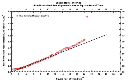We begin by focusing on the linear flow regime. A square-root of time plot (Fig. 13) would exhibit a linear behavior during this period, allowing an early estimation of k(N.xf)2, where N is the effective number of fractures, k is the matrix permeability and xfthe average fracture half-length.