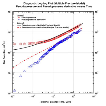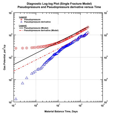 Fig. (5) shows the end of the transition from linear flow as both normalized pressures and derivatives tend to merge onto a unit slope. In other words effects of the stimulated volume depletion begin to be established. During this transition period, the "b" factor continuously declines from the initial value of 2 (linear flow) and approaches to zero.