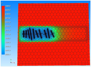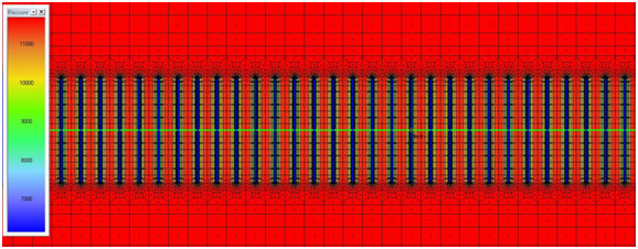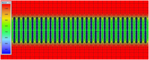 Fig. (6). Simulation response after five years. Flow regime corresponds to the depletion of the so-called stimulated reservoir volume. Pressure distribution at 5 years is shown. |