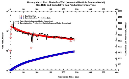The example of this section was published in 2011 [4, 5], and we acknowledge that there is no way to prove that this (or any) numerical model is a universal, long-term solution to all our problems. However, we can see from these examples that a relatively simple numerical model carrying the basic assumptions of diffusion and PVT can match pretty well, in some cases, the early years of responses of these wells.
