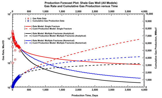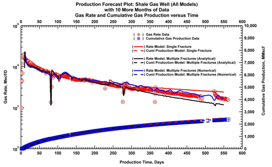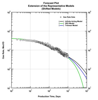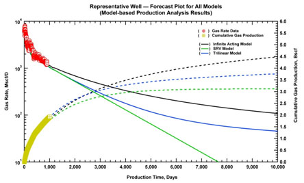 - Model-based production analysis and forecasting is the key to understanding performance characteristics and obtain improved forecasts for ultra-low permeability reservoirs. No other diagnostic can achieve the same objectives of characterizing performance potential. Use of advanced reservoir models is helpful as these models integrate critical information on reservoir description based on subsurface characterization and completion information. However, in the absence of this information, the use of advanced models is problematic, and can lead to an erroneous assessment of reservoir performance capability. In contrast, simple (time-rate and time-rate-pressure) models with certain assumptions for uncertainty ranges on model parameters can be effectively used to establish limits on well performance capability.