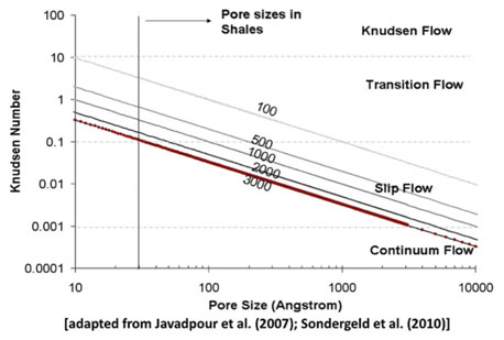 The most obvious difference between conventional and unconventional plays is the order of magnitude of the permeability (i.e., millidarcy and nanodarcy level permeability). Fig. (1) presents an illustration of sizes of molecules and pore throats in siliciclastic rocks [1]. Fig. (2) presents the Knudsen number (ratio of mean free path of the gas to pore diameter) for methane as a function of pore size for different pore pressure ranging from 100 psi to 3,000 psi. Without even considering the impact on the validity of the diffusion equations, and even considering unreasonably simple flow geometries, the ultra-low permeability alone will have substantial impact as follows: