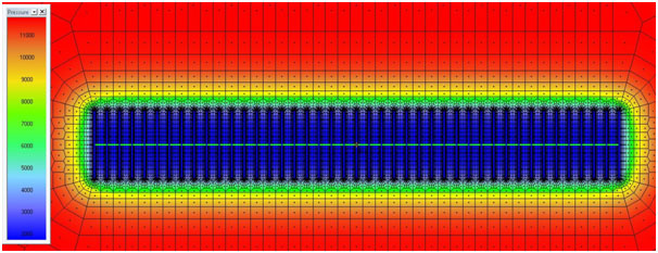Fig. (7). Simulation response after fifty years. Deviations from SRV flow regime has started. Pressure distribution at 50 years is shown. |