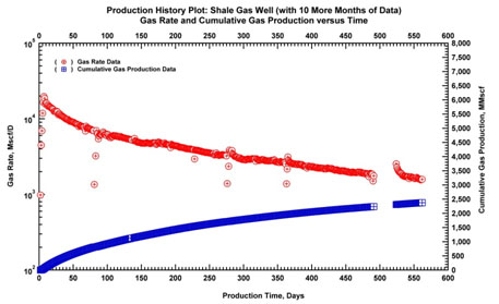 This simple model is also a first occasion to introduce the difficulty of forecasting the production of these wells, as shown in Fig. (11). We have just been starting to produce these plays and we do not have yet any rule of thumb to extrapolate this data and get an estimate or a probability function for estimated ultimate recovery (EUR).