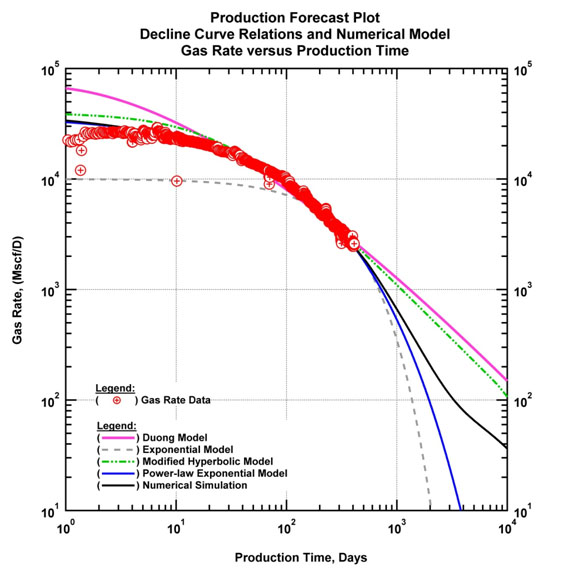 Numerous authors [6-9] have proposed various empirical rate decline relations which attempt to model the time-rate behavior observed in unconventional plays, integrating the early time transient and transitional flow regimes. None of them can extend to all unconventional plays. It is important to understand the applicability of each equation. All of these relations may produce good matches across the entire production time, but each relation may significantly diverge in the forecast and hence the estimation of EUR.