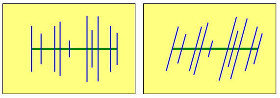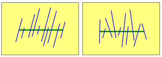 The first step towards a more complex geometry is to allow the fractures to have individual lengths and individual intersection with the well drain. They are still orthogonal to the well and their intersection is at the center of the fracture. This is shown in Fig. (26), right. In complement we can apply a global angle between the well and the set of fractures. This is shown in Fig. (26), left.