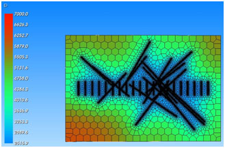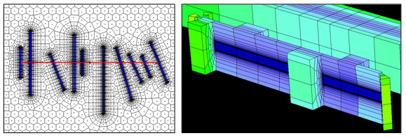 Fig. (28). Left: previous complexity, representation of the grid pattern. Right: 3D refinement for partially penetrating fractures (both numerical only). |