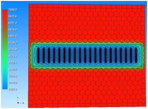 Fig. (5). Simulation response after one year. Effects of depletion of the stimulated volume begin to be established. Pressure distribution is shown at 1 year. |