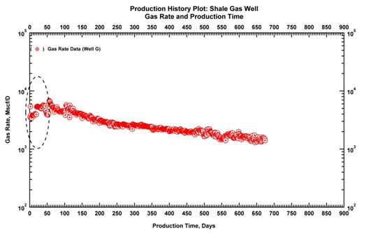 Fig. (32). Production history plot (rate and production data).Early time clean-up effects are observed. |