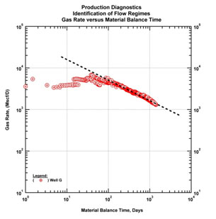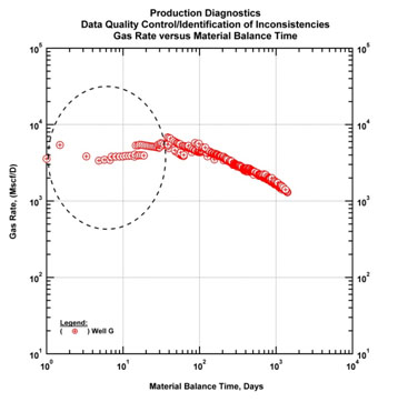 Fig. (33). Diagnostic plot (gas rate and gas material balance time). Corresponding early time clean-up effects are identified. |