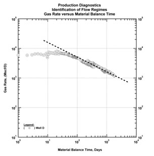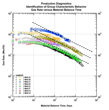 Fig. (36). Diagnostic plot (gas rate and gas material balance time). Identification of group characteristic behavior. |