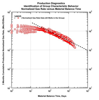 Fig. (37). Diagnostic plot (normalized gas rate and gas material balance time). Identification of group characteristic behavior. |
