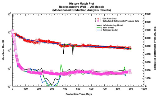 Based on the selection of the representative well, model-based analysis is performed. Previous sections describe the available models and the applicability of the models to shale plays. In this section we briefly discuss the applicability of three models to our example.