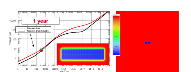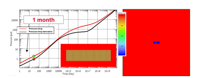 Fig. (3). Simulation response after 1 month. Linear flow regime (characterized by half slope) is observed. Pressure distribution at 1 month is shown. |