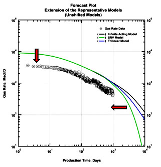 In order to prevent this overestimation, the hyperbolic trend may be coupled with a late time exponential decline. However, this approach remains empirical non-unique, yielding widely varying estimates of reserves.