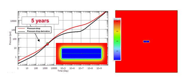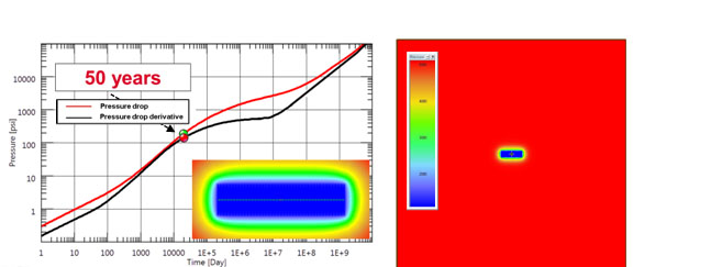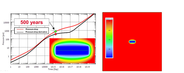 Fig. (8). Simulation response after five hundred years. Onset of infinite acting radial flow regime. Pressure distribution at 500 years is shown. |