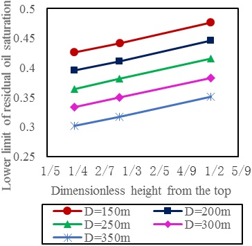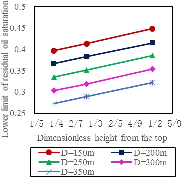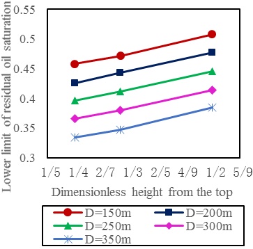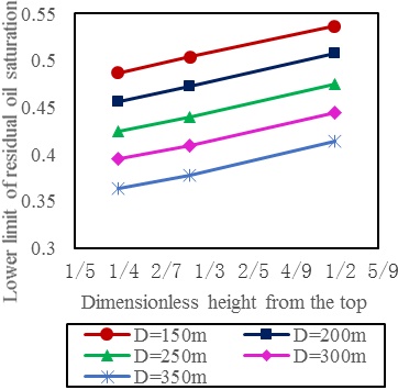 From the figure we can obtain that when the dimensionless height from the top and the effective thickness were uniform, the average remaining oil saturation decrease with the distance between oil wells and water wells. While the dimensionless height from the top and the distance between oil wells and water wells were uniform, the average remaining oil saturation decrease with the increase of effective thickness. And when the distance between oil wells and water wells and the effective thickness were uniform, the average remaining oil saturation was smaller while the value of dimensionless height from the top was larger, which could allow side-tracking with short radius at larger distance from the top.