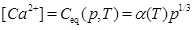 A numerical solution of these equations is shown in Fig. (1), which shows the calcium concentrations as a function of the partial pressure of CO2 at the temperature T=20 °C. Recall that the CO2-pressure is taken to be equal to fluid pressure, p, and we therefore have that the carbonic acid is proportional to the fluid pressure. It is seen from the charge balance that [HCO-3] is close to 2[Ca2+], since these two concentrations dominate. This approximation is reasonable in the acidic regime, which applies when CO2 is dissolved in the water phase. The use of [HCO-3]≈[Ca2+] allows for an approximate expression for [Ca2+] as a function of fluid pressure. The equilibrium expressions from (12) to (14) can be combined into the following expression for [Ca2+]