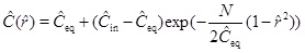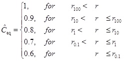 From the definition of the Damköhler-number it follows that there is a distance rN=r(N) for each number N. We will now look at an example that has Ĉin=Ĉeq=1 for r>r(N=100). In this case, the characteristic concentration C 0 is, therefore, the equilibrium concentration for r>r100. The dimensionless equilibrium concentration drops as a piece-wise constant as follows